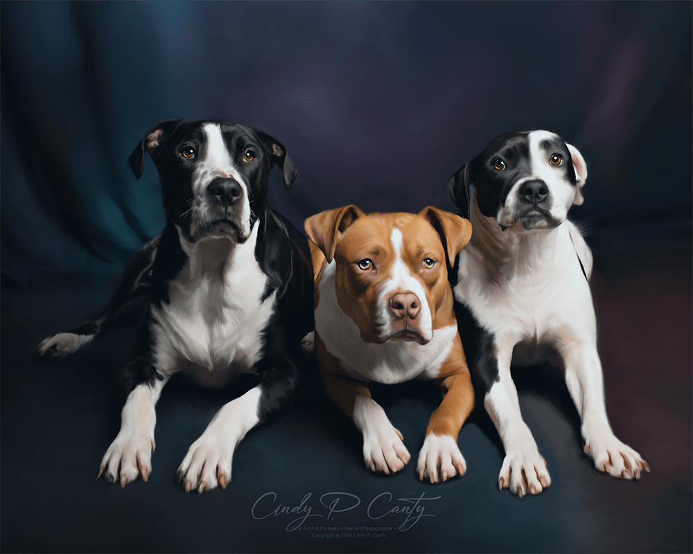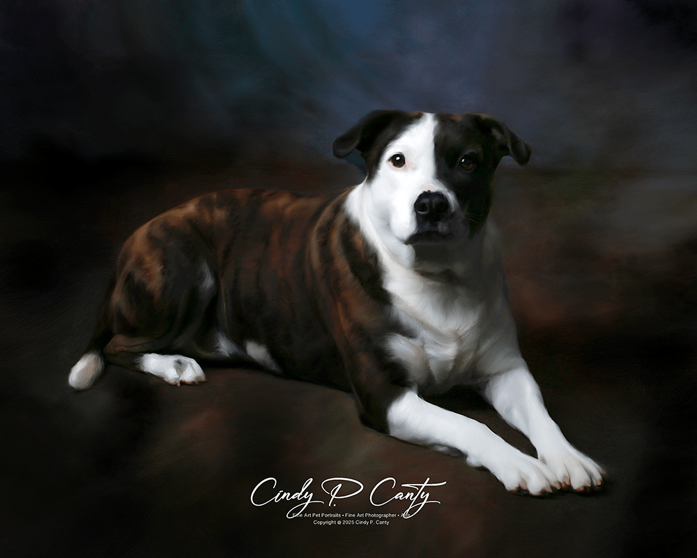 Each painting begins with a carefully composed digital reference image of your pet captured during the portrait experience. From there, the image becomes the foundation for a hand-crafted transformation. Using a blend of modern and traditional painting techniques, the original image is layered with brushstrokes, textures, and artistic detail.